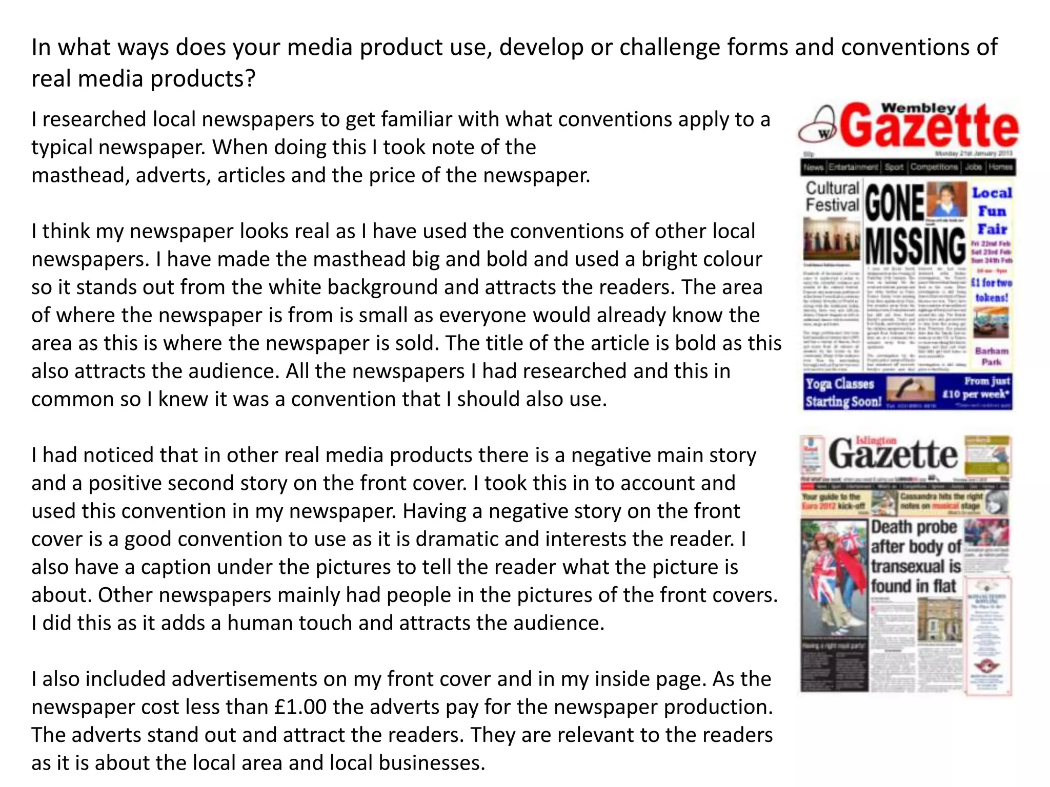 The student created a newspaper, poster, and website to simulate a real media product. They researched conventions from local newspapers to make their newspaper look authentic. This included using a bold masthead, relevant advertisements, and captions under photos on the front page. Feedback from an online survey and social media comments helped the student evaluate what the public wanted and how to improve. Technologies like Google, SurveyMonkey, WordPress, Serif applications, PowerPoint, and SlideShare were used at different stages for research, planning, construction, and evaluation.