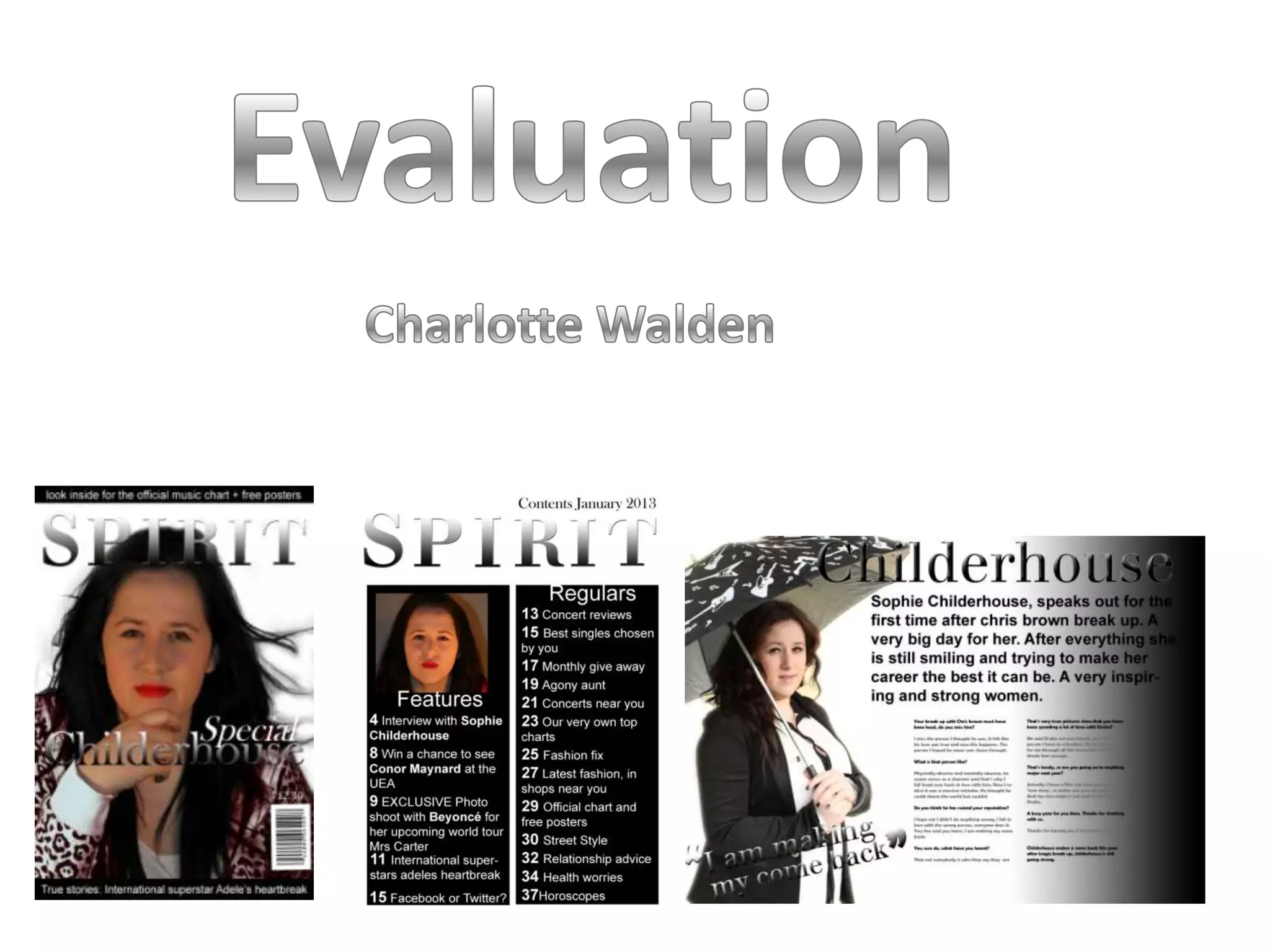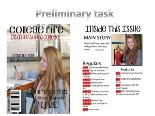 The document describes the process of creating a music magazine cover and layout. The creator was inspired by a Vogue magazine cover they saw, particularly liking how it was set out like a poster and had bold writing for stories. For their music magazine, they aimed for a sophisticated look with neutral colors and a serious model on the cover. Feedback noted the contents page could be improved, so the creator added more color and spacing to make it look more professional while keeping the overall style. Through this process, the creator learned Photoshop skills that improved their work.