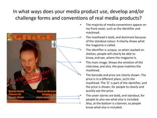 The document discusses the conventions used in the student's media product and how it compares to real magazines. The student aimed to have a bold masthead and central cover image like real magazines. However, they positioned the cover lines on the sides rather than bottom for simplicity. Throughout the magazine, they maintained a consistent orange and red color scheme and bold text for visibility. The layout of sections in the contents page and double page spread were also designed for clear reading like conventions in magazines but with some modifications for ease of use.