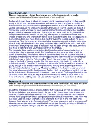 The layout of the recipe cards has been kept simple yet professional, featuring minimal information on the front such as the title, image, and logo. The back contains the full recipe and a small decorative image. Consistency is maintained across cards through similar layout, colors, fonts, and logo/image placement. Some areas could be improved, such as ensuring consistent image and font sizes. The images are a mix of original photos and stock images to balance quality with limited time and resources. Colors, themes, and images aim to appeal to the target audience of teenage girls by featuring heart shapes, the word "love", and the symbolism of Cupid.