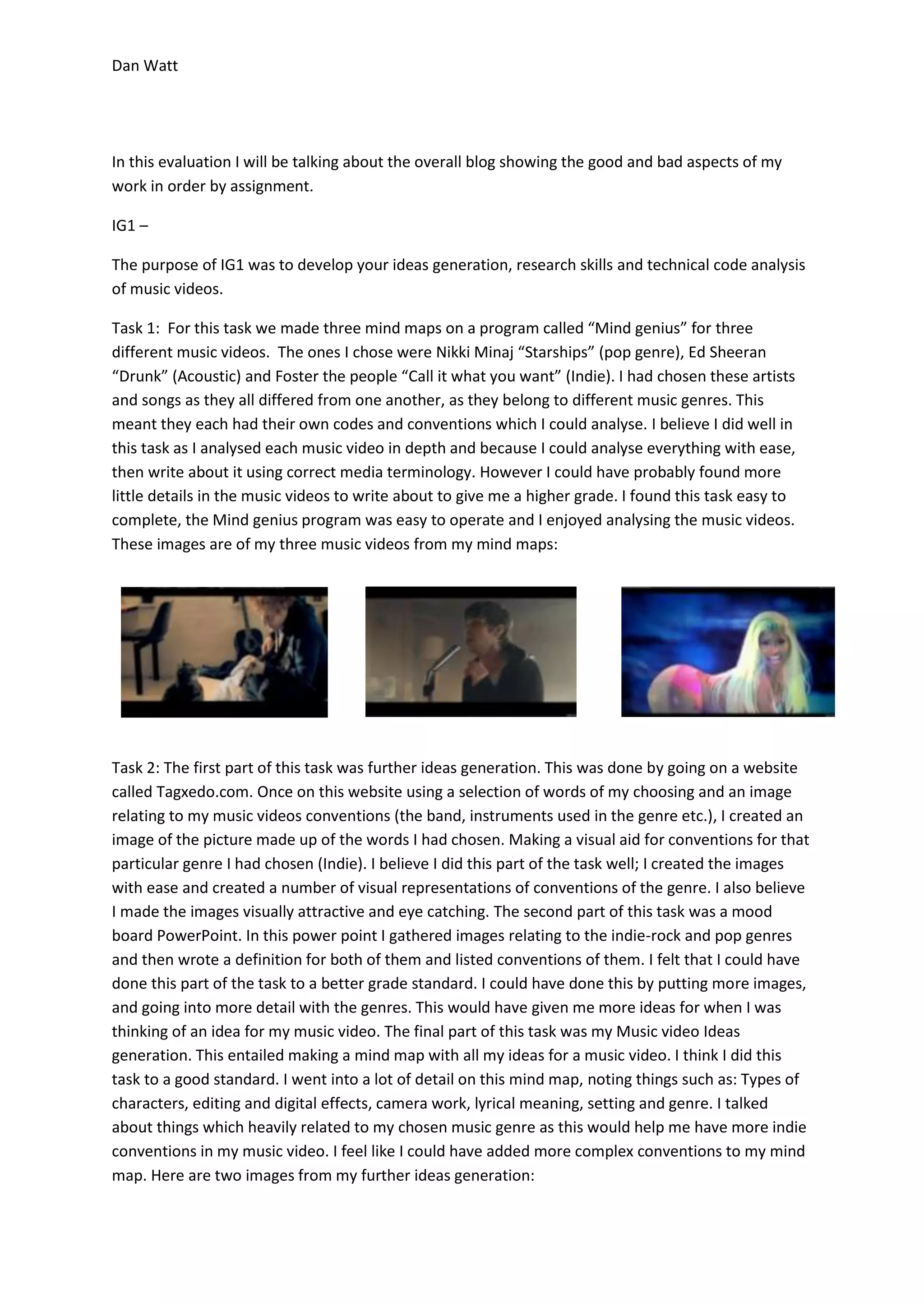 Dan Watt evaluates his work on various assignments for a media studies course. He created mind maps analyzing different music videos, tags representing music genres, and a music video ideas mind map. He also made presentations on music video jobs and budgets. Watt wrote scripts for a group music video and storyboarded shots. For his rough cut, he edited footage and included a variety of shots. In his final cut, he added fade transitions and ended with a fade to black. While pleased with his variety of shots and overall flow, he notes some footage was too similar and the chosen song limited flexibility.