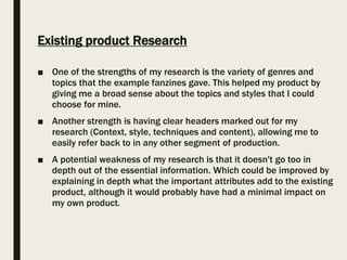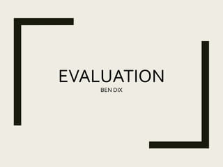 The document provides an evaluation of Ben Dix's fanzine project. It summarizes the strengths and weaknesses of various aspects of the project, including research, planning, time management, technical qualities, and audience appeal. It also includes feedback from peers which praises the professional presentation and informative content, but suggests breaking up blocks of text with more images. Based on the feedback, Ben Dix agrees the color scheme works well but disagrees the back page needs content, and would break up long passages of text for improved readability.