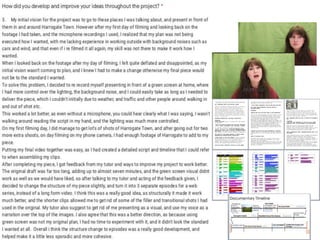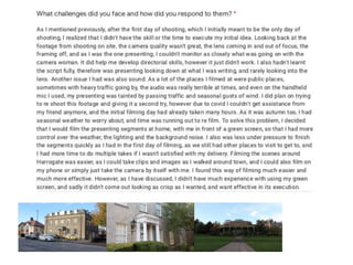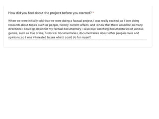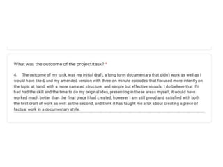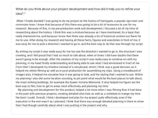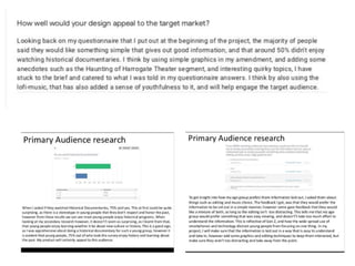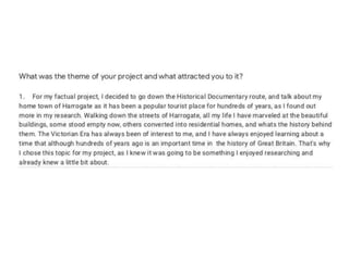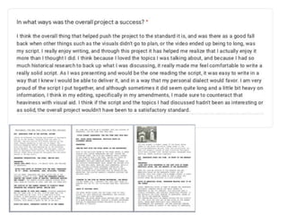 The document discusses Madeleine Ross' research for a documentary project. It includes slides on the Georgian expansion and Royal Baths that she found through in-depth research. It also discusses how she looked at different documentary genres but wished she focused more on historical documentaries. Examples of initial music choices and issues with using a green screen during filming are provided.