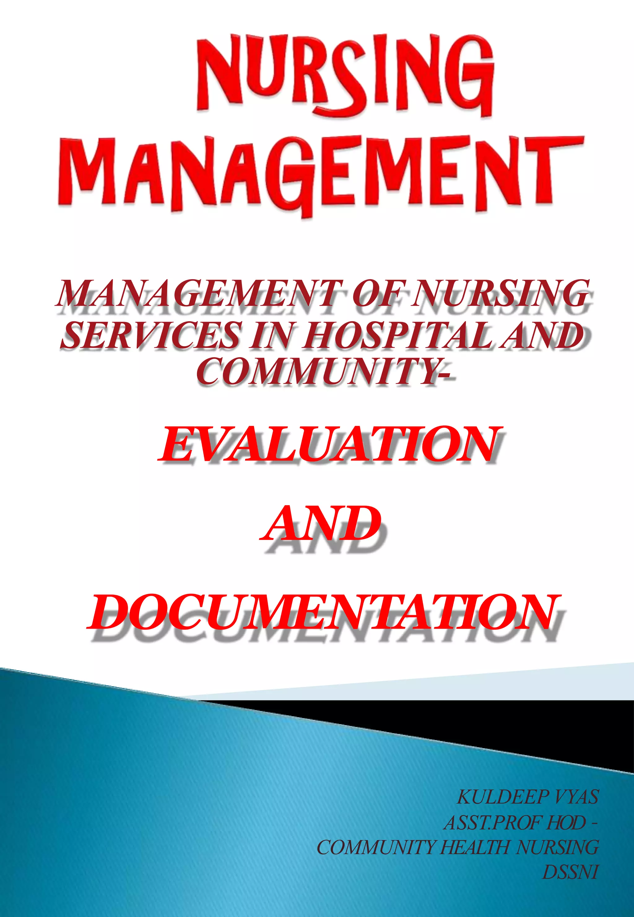The document outlines the evaluation and documentation processes in nursing services, emphasizing the importance of structured evaluation programs that encompass educational objectives, teaching procedures, student progress, and outcomes. It details the steps for constructing evaluation tests and the principles, methodologies, and criteria for selecting evaluation tools to ensure validity, reliability, and effectiveness. Additionally, it discusses the roles of records and reports in clinical practice to facilitate communication among healthcare professionals, enhance patient care, and maintain standards of nursing documentation.