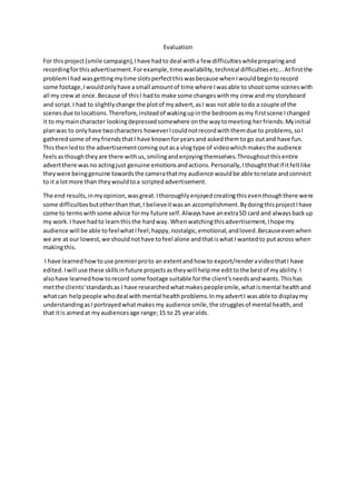 The document provides an evaluation of a "smile campaign" project. There were difficulties with time availability and technical issues that required changes to the storyboard, script, and plot. Scenes had to be cut or altered due to location problems. Friends were gathered to record genuinely instead of acting. Overall, the end result was great though difficult, and lessons were learned about planning, backups, and skills in video editing and recording footage for clients.