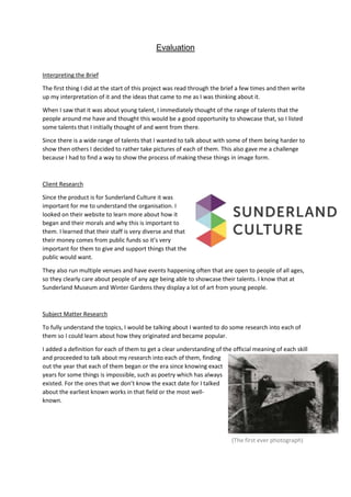 The document summarizes the process taken to create a photography project showcasing young talents in the Northeast region. It involved interpreting the brief, researching the client and subject matter, surveying an audience, and conducting pre-production, production, and post-production. During the process, the creator learned how to plan shoots through schedules, organize resources, improve photo editing skills like lighting and realism, and maintain consistency in their creative vision from start to finish.