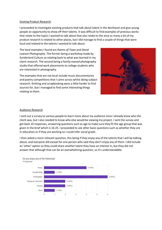 The document summarizes the process taken to complete a photography project for a client. It involved interpreting the brief, researching the client, subject matter, existing products, and intended audience. Photos were taken of various talents over three days then edited over a week. Feedback was gathered and edits made before finalizing high quality prints with explanations of the thought process for each. Overall the process helped the creator learn skills in planning, editing, and maintaining a consistent vision throughout the project.