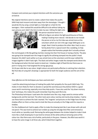 The advertising campaign uses children's drawings as images to portray the vulnerable side of homeless teenagers and remind viewers that they are still children. Each poster includes the charity's logo and contact details to raise awareness and allow people to donate. While the original intentions were to use different techniques like lighting effects or edited family photos, the final children's drawings are more appropriate for the target age group of 16-24 year olds. The campaign aims to increase sympathy for homeless youth and raise awareness of the issue by triggering memories of viewers' childhood hopes for family and home.