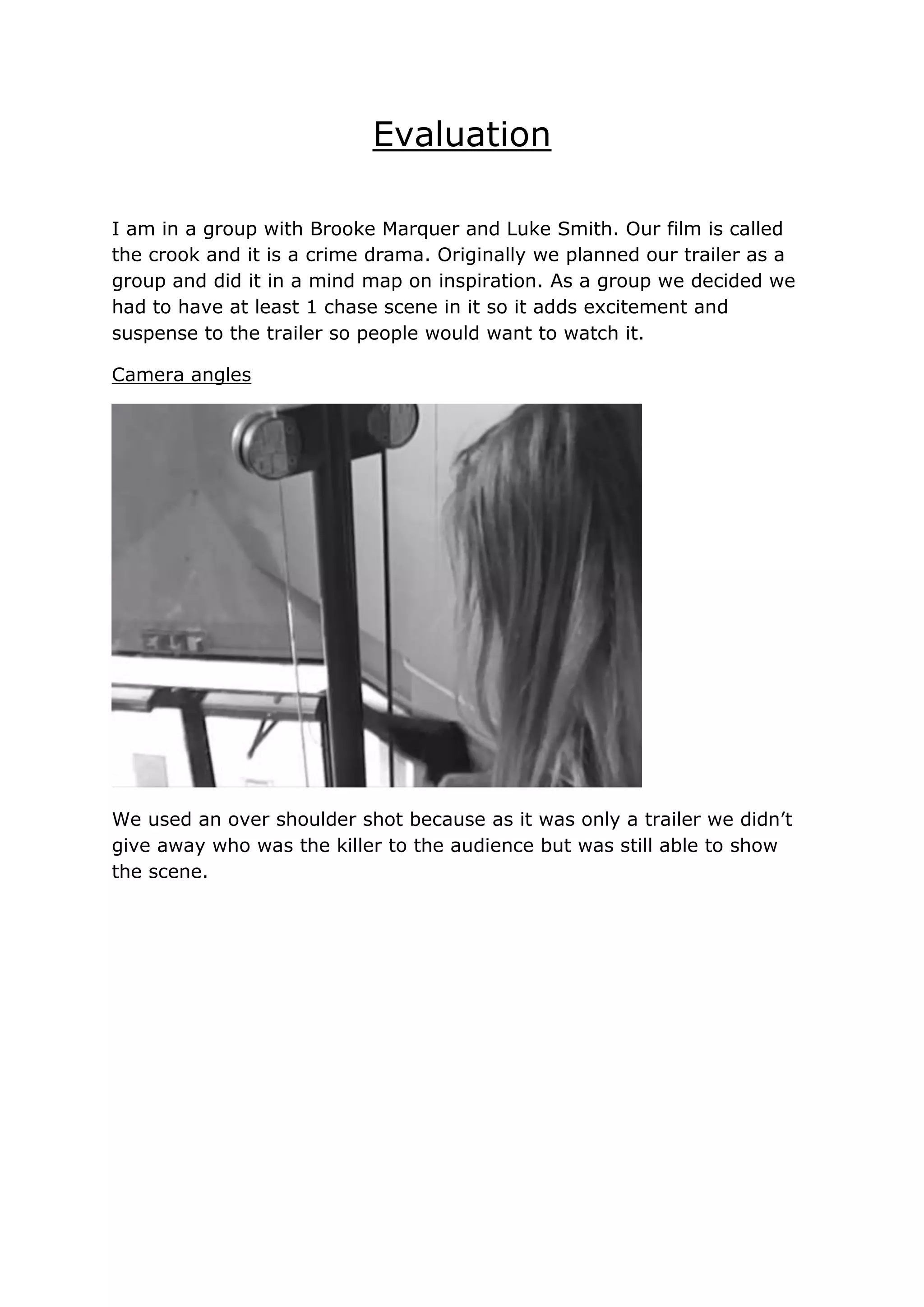 The document discusses the evaluation of a group film project called "The Crook." It is a crime drama. Originally the group planned the trailer as a mind map and decided it needed at least one chase scene to add excitement and suspense. Camera angles like over the shoulder shots were used to not reveal the killer while still showing the scene. Close ups of feet were used so no one knew the character was the killer. Research helped with ideas for the trailer and learning the target audience of ages 12 and up who would enjoy the action. Editing feedback suggested making titles longer to read and adding sound effects.