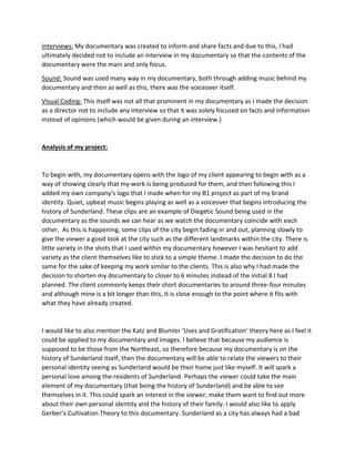 The document discusses the codes and conventions commonly used in documentaries, including voiceovers, real footage, interviews, titles/text, sound, set ups, and visual coding. It then analyzes the student's own documentary project, noting their use of a voiceover, real footage, sound/music, and credits to conform to documentary conventions. The student reflects on their time management, adherence to the brief, skills developed, and incorporation of feedback throughout the project.
