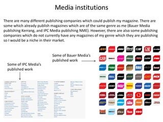 Bauer Media or IPC Media would be good choices to publish the magazine because they are established in the genre and not too large. While other publishers may not have experience in the genre or be too big, Bauer and IPC are recognizable with experience publishing similar magazines, making them more likely to successfully publish and promote the new magazine. After reviewing the options, Bauer Media is selected as they have published many magazines in the same genre.