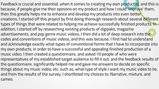 The document discusses how receiving feedback helped improve the author's music video project. Some key points: