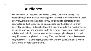 The document summarizes the results of an online survey conducted to gather audience feedback on a music video. Only 36 people completed the survey, indicating that online surveys may not be reliable for gathering responses. The majority of respondents believed the video conveyed generic pop song conventions. Most also felt the video was lyrically visual, though some disagreed. The document discusses lessons learned from each question, such as being more explicit in conveying elements and ensuring survey questions are clearly worded. It concludes that more research is needed to create promotional materials that are more effective at persuading people to buy an album.