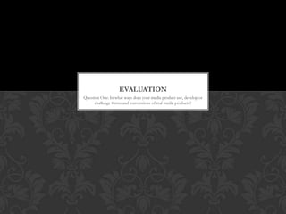 This document evaluates the media product of a magazine called "Juice" against conventions of real magazines. It summarizes the key design elements of the magazine, including the use of a one-word title in pink in the masthead, a model on the front cover engaging with the audience, additional images promoting products and celebrities, and professionally styled photography. The double-page spread uses an interview format with quotes, appropriate language for teenagers, and follows conventions for layout of text and images. Overall, the magazine draws from typical conventions of pop magazines in its design, content, and categories to engage its target audience.