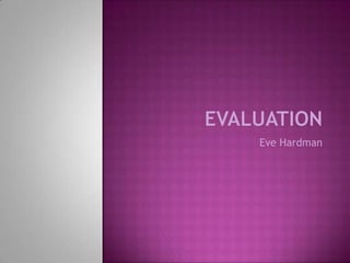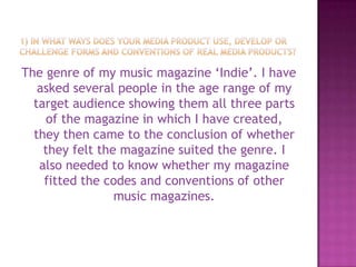 The document discusses the development of an indie music magazine by the author Eve Hardman. She challenged her initial idea for the front cover photo shoot and went with a simpler image of her cover star holding an acoustic guitar to better portray an indie vibe. She chose to represent people in the magazine equally in terms of gender and used subjects in the target audience age range. The magazine focuses on portraying people as they would be perceived in everyday life without challenging stereotypes. The author wants to partner with established magazine distributors like Bauer who have experience distributing successful music magazines.