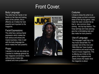 It analyzes the front cover image of an artist, noting that her body language and facial expression are meant to portray her as powerful and important. Her costume of an Adidas jumper and bucket hat are meant to represent common hip hop fashion.