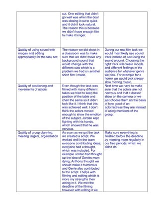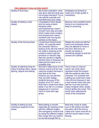 The document provides an evaluation of the quality of various aspects of a student video project. It notes both strengths and areas for improvement. For shot quality, it acknowledges steady shots but identifies uneven panning. Framing could have better shown characters' emotions. Mise-en-scene was not focused on and did not effectively set the scene. Editing was generally smooth except for one abrupt cut. Actors showed nervousness that detracted from emotion. Planning met deadlines but editing finished close to the deadline. The group worked well together with individual strengths, but leadership could ensure all aspects are completed on time.