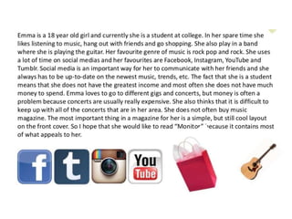 The document discusses the design choices made for various elements of a magazine media product, including the masthead, front cover, contents page, and a double page article spread. For each element, the student compares their design to examples from other magazines and explains how their choices develop or challenge conventions. The student also discusses how the magazine would represent its target audience and the technologies learned through the process of constructing the media product.