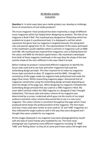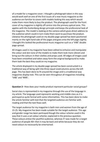 - The document discusses a music magazine product the author created, evaluating how it uses and develops conventions from real music magazines.