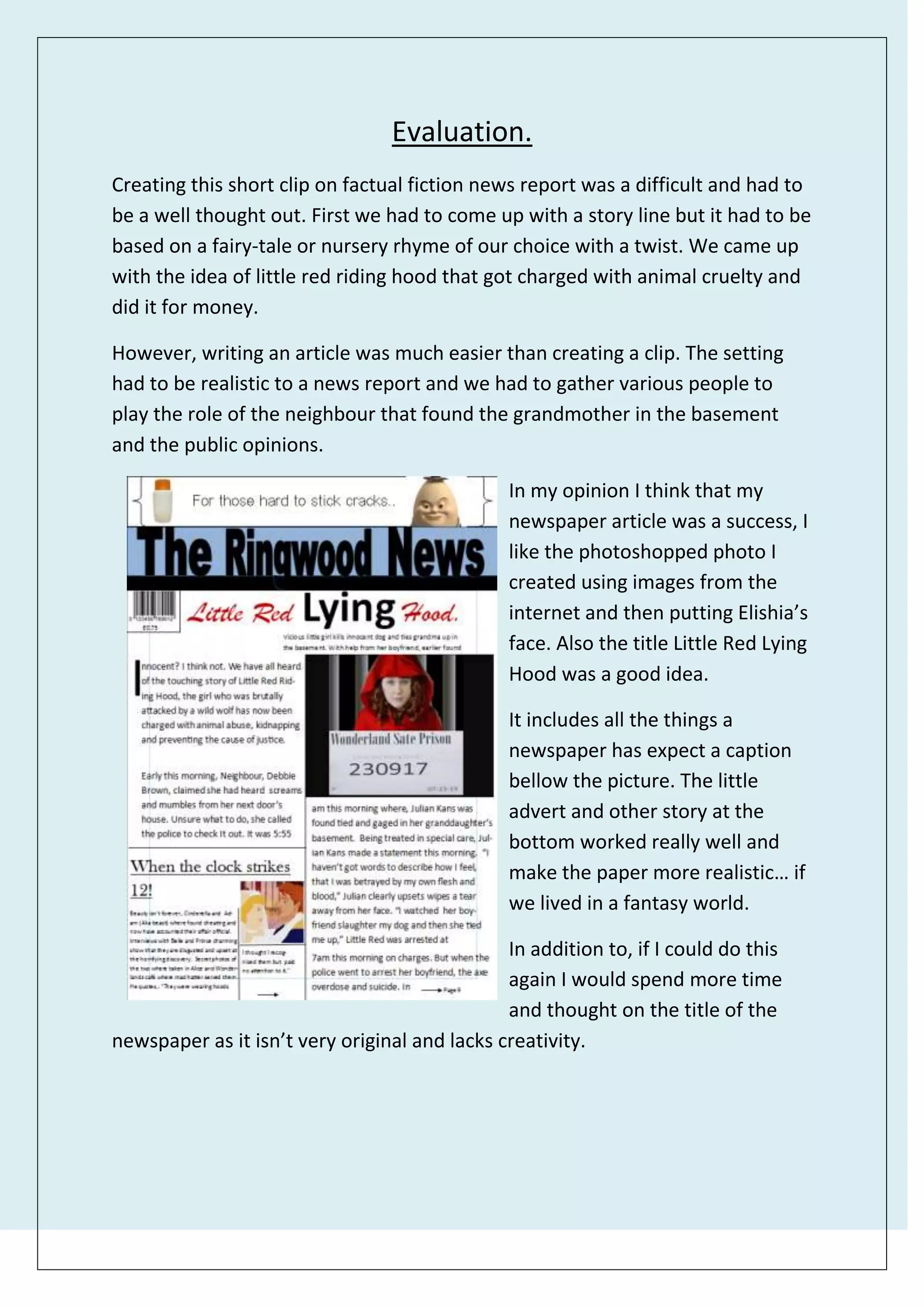 This document provides a self-evaluation of a group's project to create a factual fiction news report based on Little Red Riding Hood. It discusses both the process of writing a newspaper article on the topic and creating a video news clip. Some specific challenges mentioned include coming up with an original storyline, gathering actors, and ensuring settings and dialogue seemed realistic. Areas for potential improvement include spending more time on the newspaper title, improving actors' line delivery, choosing better filming locations, and adding more action to engage viewers.