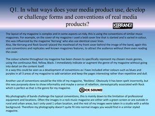 The document discusses how the student's media product uses and develops conventions of real music magazines. Specifically, it replicates features of magazines like Kerrang! such as the slanted cover line and placement of the masthead behind the band image on the front cover. The color scheme represents the chosen music genres. While maintaining conventions, the student also challenges some, such as using unprofessional band photos taken with a white background instead of on location. The student learned various technologies like Photoshop and Blogger in constructing the magazine.