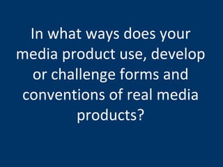 The document discusses a student's evaluation of their short horror film project. It covers various aspects of the film including its use of horror conventions, representation of social groups, target audience, and what the student learned about film technologies. The student conducted audience research which found that viewers could relate to characters, felt the plot was believable, and rated the opening sequence highly overall.