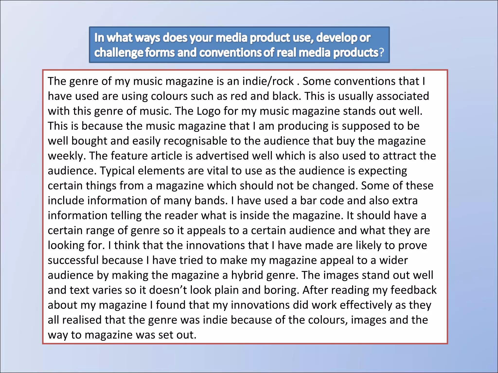 The document describes an indie/rock music magazine that the author has created. Some key elements included using red and black colors associated with the genre, having a logo that stands out, and including information on various bands. The author tried to appeal to a wider audience by making it a hybrid genre magazine. Feedback indicated the innovations worked as readers recognized it was indie based on the colors, images and layout.