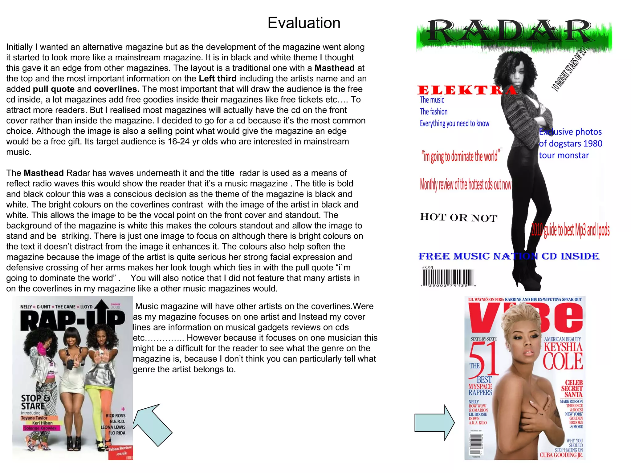 The document provides an evaluation of a student's music magazine project. The student chose a black and white theme throughout. For the cover, they selected a striking image of the featured artist in black and white. The contents page also follows the black and white theme and includes a picture and descriptions of articles. For the double-page spread, the student included multiple photos of the artist in different poses with descriptive text to give readers insight into the artist.