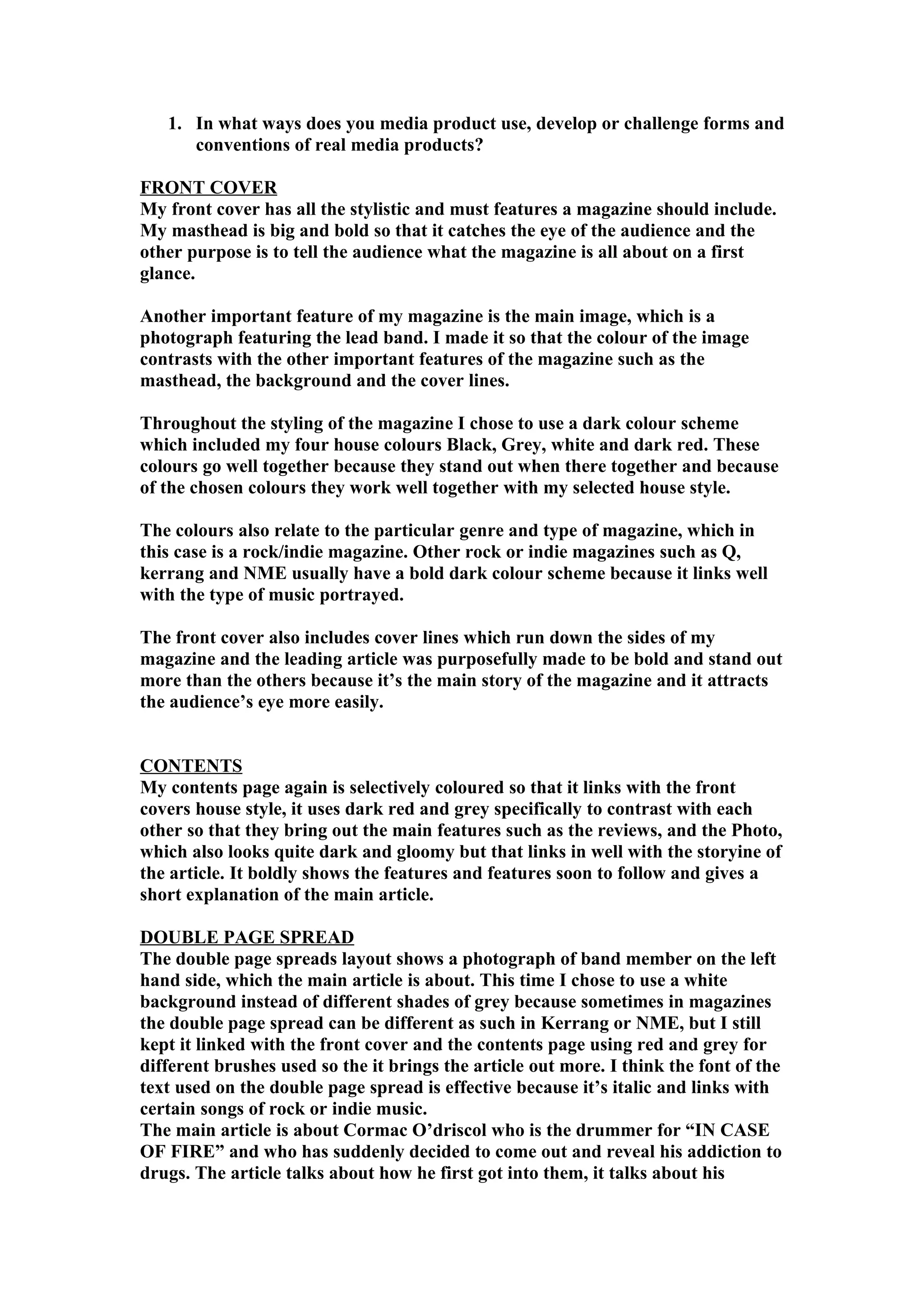 This magazine targets 15-20 year olds interested in rock/indie music. It uses a dark color scheme of black, grey, white and dark red throughout to match the genre. The front cover features the lead band and cover lines. The contents page highlights upcoming articles in dark red and grey. The double-page spread has a photo of the band member discussed in the lead article about a drummer revealing his drug addiction. The magazine aims to attract its target audience by covering their interests in music, festivals and celebrities' personal lives.
