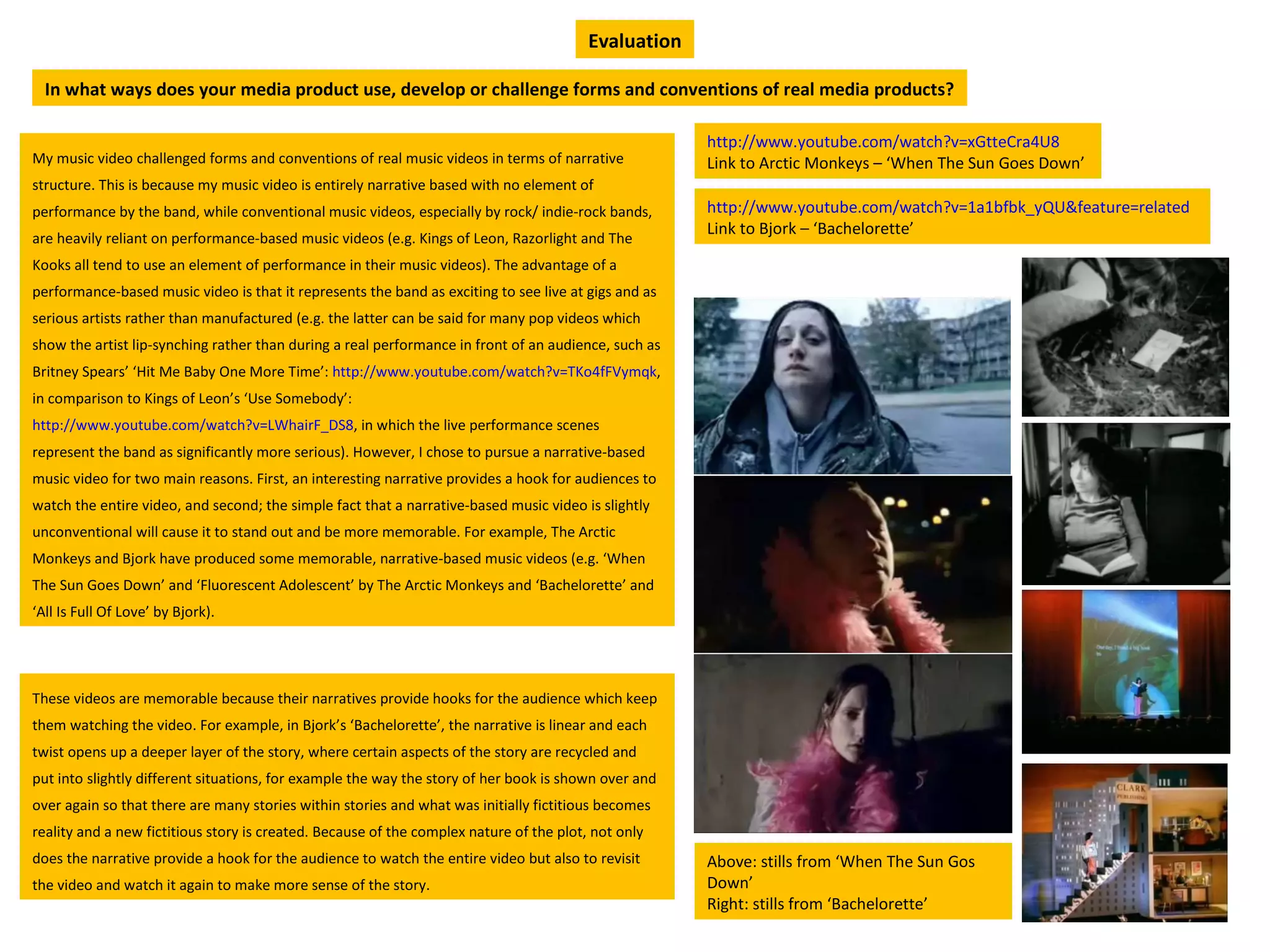 The student created a music video for their band that challenged conventions of real music videos by being entirely narrative-based rather than performance-based. They received feedback on the video from classmates aged 16-18 through questionnaires. The feedback showed that overall enjoyment of the video was rated 3.4 out of 5, with enjoyment increasing with age. Females on average enjoyed it more than males. The student analyzed the data to evaluate strengths and ways to improve engagement for different audiences.