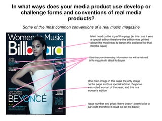 The document discusses the creation of a funk music magazine and its adherence to or deviation from conventional music magazine elements. Key features like a prominent masthead, main image, and vibrant colors aimed at a youthful audience were emphasized, with the goal of making the magazine stand out in the market. Feedback from a focus group highlighted both positive and critical responses, informing further development of the magazine's unique brand identity.