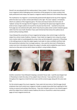 Overall, the document summarizes the key design elements and conventions used in creating a music magazine called "Upbeat". The front cover features a close-up photo of a pale subject with additional hair added in Photoshop to make them stand out. Consistent colors and fonts are used throughout the magazine to maintain a house style. The contents page includes more text than typical to emphasize the amount of content and features a picture of a subject with an indirect gaze, following music magazine conventions.