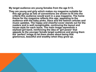 The document describes the target audience and content for a magazine aimed at young girls ages 9-13. It details that the magazine contains pink colors, fashion articles, music updates, and images of girl bands to appeal to its young female readers. It also introduces Katie, a typical 12-year-old consumer of the magazine who enjoys dancing, singing, and following artists like Rihanna and One Direction. The magazine costs £1 and includes freebies like posters, with a subscription offer of 5 months for £4.