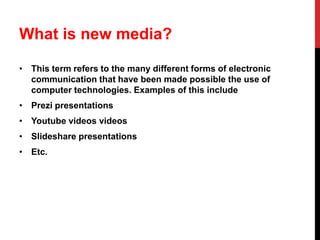 This document discusses different forms of new media that can be used to display work online. It describes tools like Blogger, Slideshare, Prezi, video cameras, tripods, Premier Pro, YouTube, and Photoshop. Blogger allows creating online blogs to display research and production work. Slideshare and Prezi can be used to embed PowerPoint presentations. A video camera and tripod were used to film a music video. Premier Pro was used to edit video footage. YouTube is used to upload finished videos. Photoshop allows altering photos for things like advertisements.