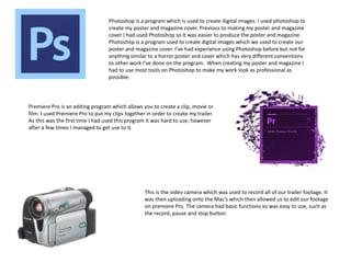 The document discusses different software programs and websites used for creating digital media projects. Microsoft Word is a word processing program that allows formatting text and inserting images. Microsoft PowerPoint is similar but designed for presentations with slideshows. Photoshop is an image editing program used to create digital images like posters and magazine covers. Premiere Pro is a video editing program used to assemble video clips into a trailer. Websites like YouTube, Dafont, Slideshare, FreeStockMusic and Blogger were also utilized to share and promote created works.