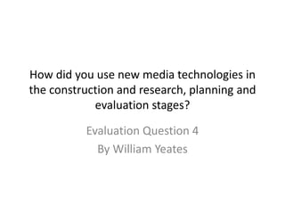 The document discusses the use of new media technologies in various stages of a project. A HD camera and tripod were used to film an artist, capturing close-up shots. Photoshop was used to create advertisements and a digipack, with tutorials consulted to learn techniques. The digipack incorporated layered photos to show locations featured in a music video. Apple Movie Maker was used to edit the video, applying effects to make professional-looking fading, jumping and "limitless" scenes.