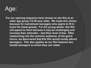 Our opening sequence aims to target teenagers aged 15-30, as well as both male and female audiences. It focuses on teenagers because they want to fit in and know the latest gossip, and young adults because horror films can provide adrenaline. Research shows horror appeals mostly to teenagers. The social demographic targeted is working classes C1 and C2, which includes many students and teenagers. The overall target audience combines these factors to engage and captivate viewers through tension, narrative mystery, and entertainment.