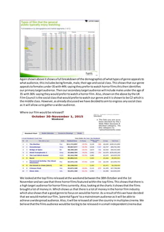 - The target audience for the horror film is females and males under 35, primarily middle class. Research from the UK Film Council supports this audience.