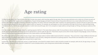 The document discusses targeting a 15+ age rating for a media product and the ideal target audience. A 15+ rating allows some violent content but restricts strong language, sexual content, and drug use. The target audience is described as middle-class 15-17 year olds interested in crime/action genres. An example target viewer named Tom, age 19, is provided who enjoys crime TV shows and films from the genre. The document suggests an urban audience may also be interested due to the crime genre relating to inner city influences.