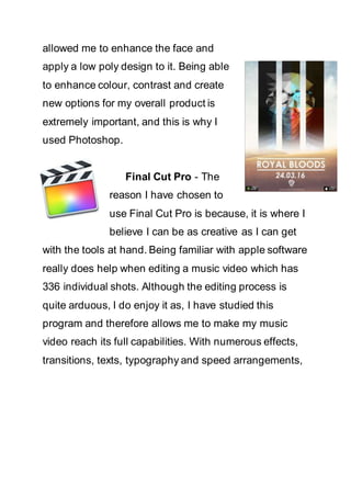 The document discusses the various media technologies and software used at different stages of a project. Photoshop was used to create ancillary texts and explore graphic design. Final Cut Pro was used for editing the 336-shot music video due to familiarity with its effects and transitions. Quicktime allowed previewing of exported video. Google was used for research, and YouTube, Blogger, and Prezi were used for uploading and presenting coursework. Survey Monkey conducted audience research. Storage devices like SD cards and a hard drive backed up files. Charging devices kept equipment powered. An iMac was used for editing due to familiarity with Apple software. A DSLR and iPhone captured video, along with additional lenses and a slider and