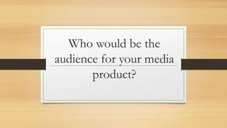 - The document discusses research conducted to determine the target audience for a new music magazine.