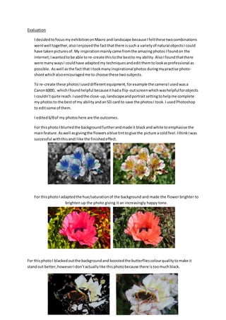 The document summarizes an evaluation of a photography exhibition focused on macro and landscape photography. It discusses the inspiration for the subject matter, equipment used, editing process of 6 photos in Photoshop, strengths and weaknesses discovered, and feedback received. The key strengths were a black and white flower photo and beach landscapes, while the butterfly photo was the weakest due to over-editing. Feedback indicated changing the exhibition title to better fit the photos and focusing on a clearer theme.