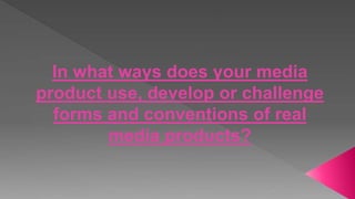 This document discusses how the author's media product uses conventions of real music magazines to attract their target teenage female audience. Specifically, the author followed conventions like linking the main image and sell line, using direct eye contact in images, including feature photos and posters, and signing the editor's letter in script font. The author represented their target audience and other social groups in traditional feminine ways seen in magazines. They included diverse models and addressed readers directly to attract their intended teenage girl readership.