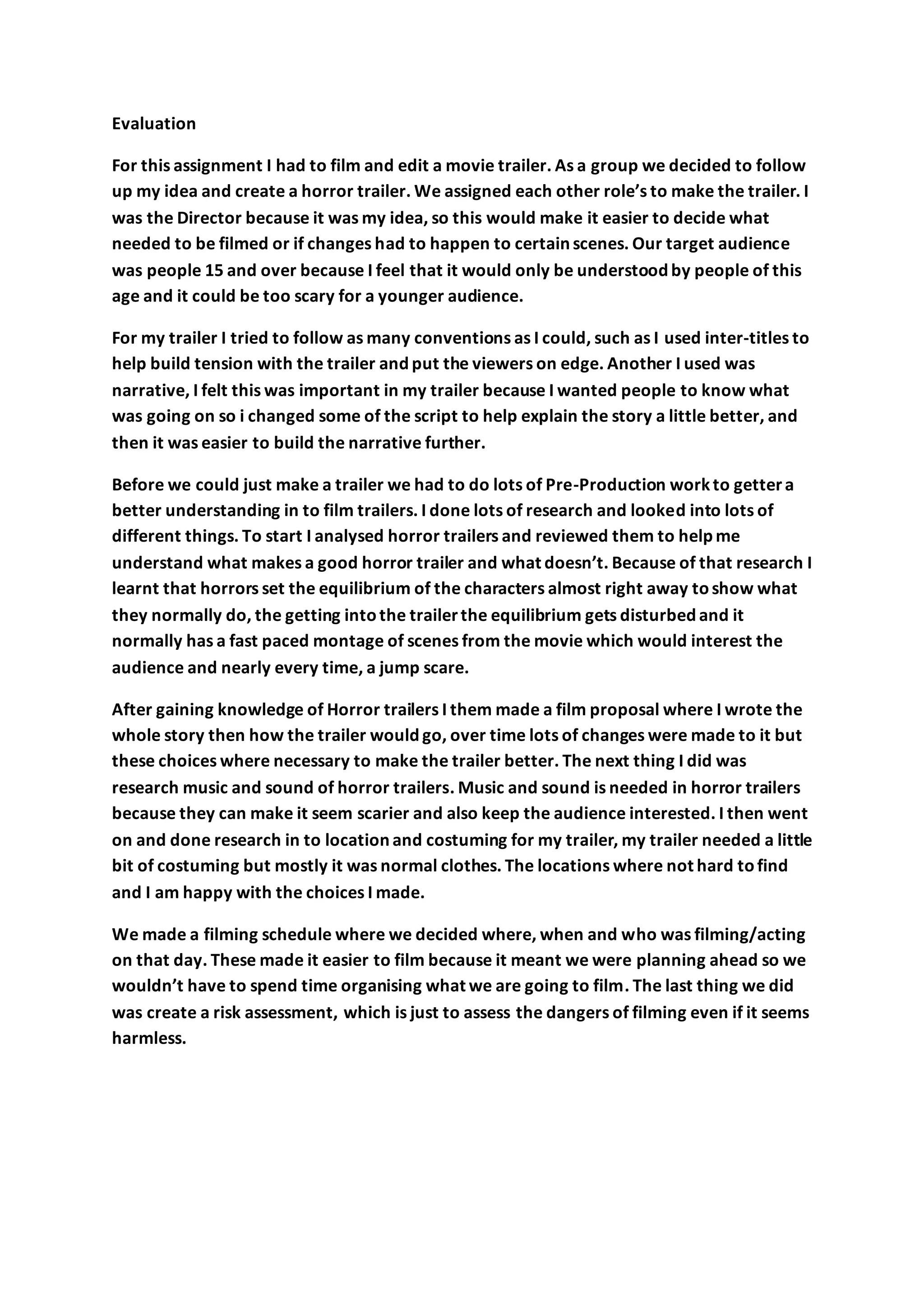 1) The document discusses the process of creating a horror movie trailer for a class assignment. It describes conducting research on horror film conventions, writing a film proposal, planning production through location scouting, scheduling, and risk assessment.