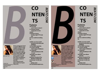 2) The contents page sticks to the magazine's color scheme. The editorial uses personal pronouns to develop a connection with readers.