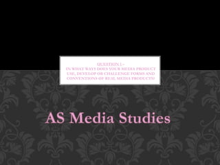 The document discusses the development and challenges of creating a music magazine to meet industry conventions. It describes researching conventions from magazines like NME and incorporating elements such as the masthead, cover lines, and images. Developing the masthead and cover images posed initial challenges. The target audience is identified as teenagers aged 14-20 based on a survey. Content and images aim to attract this audience by focusing on an indie musician and incorporating props related to rock/indie music. The magazine would be distributed by The Wire, an independent magazine covering alternative music genres aligned with the magazine's content.