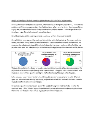 For their final major project, the student created 3 movie posters to advertise a horror film. They originally planned to create a film trailer but changed to posters due to time constraints. They took portrait photos of a model and used Photoshop to make her look possessed. They received positive feedback from peers that the posters were professionally made and intriguing. The student feels they acquired new Photoshop skills and successfully reached their target audience of teens and young adults with the posters.