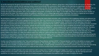 The document summarizes how the opening of a horror/thriller film attracts its target audience. It begins with the production company and distribution company logos, which use black and white colors and fonts that signal the genre. Characters are then introduced without revealing too much of the plot. This leaves the audience wondering what will happen and wanting to watch more. For example, a girl's murder is shown at the end but the why, how, and killer are not revealed. The opening also relates to psychological theories about diversion and exploring personal identity. Mysterious, eerie music builds tension and engages viewers by setting the right mood.