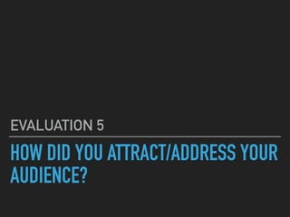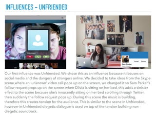The document discusses how the creators of a thriller film attracted their audience and addressed conventions of the genre. They took influences from the films Unfriended and scenes involving anonymous masks and images of girls in the woods. Their film focuses on an innocent girl, Olivia, who saves herself from an online predator, offering a unique twist. They used technology, natural lighting, music, and cliffhanger endings to build tension and draw in viewers.
