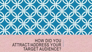 The document discusses how the author attracted and addressed their target audience for a music magazine. They used formal language and bold formatting for questions to draw attention. Secondary research of other magazines showed their target was likely 15-25 year olds. Conventions like headlines and colors were analyzed to meet audience expectations. The target audience for the author's hip hop magazine is teenagers aged 15-20 who would be interested in the genre. Primary research through questionnaires helped identify the target and gather feedback to inform decisions.